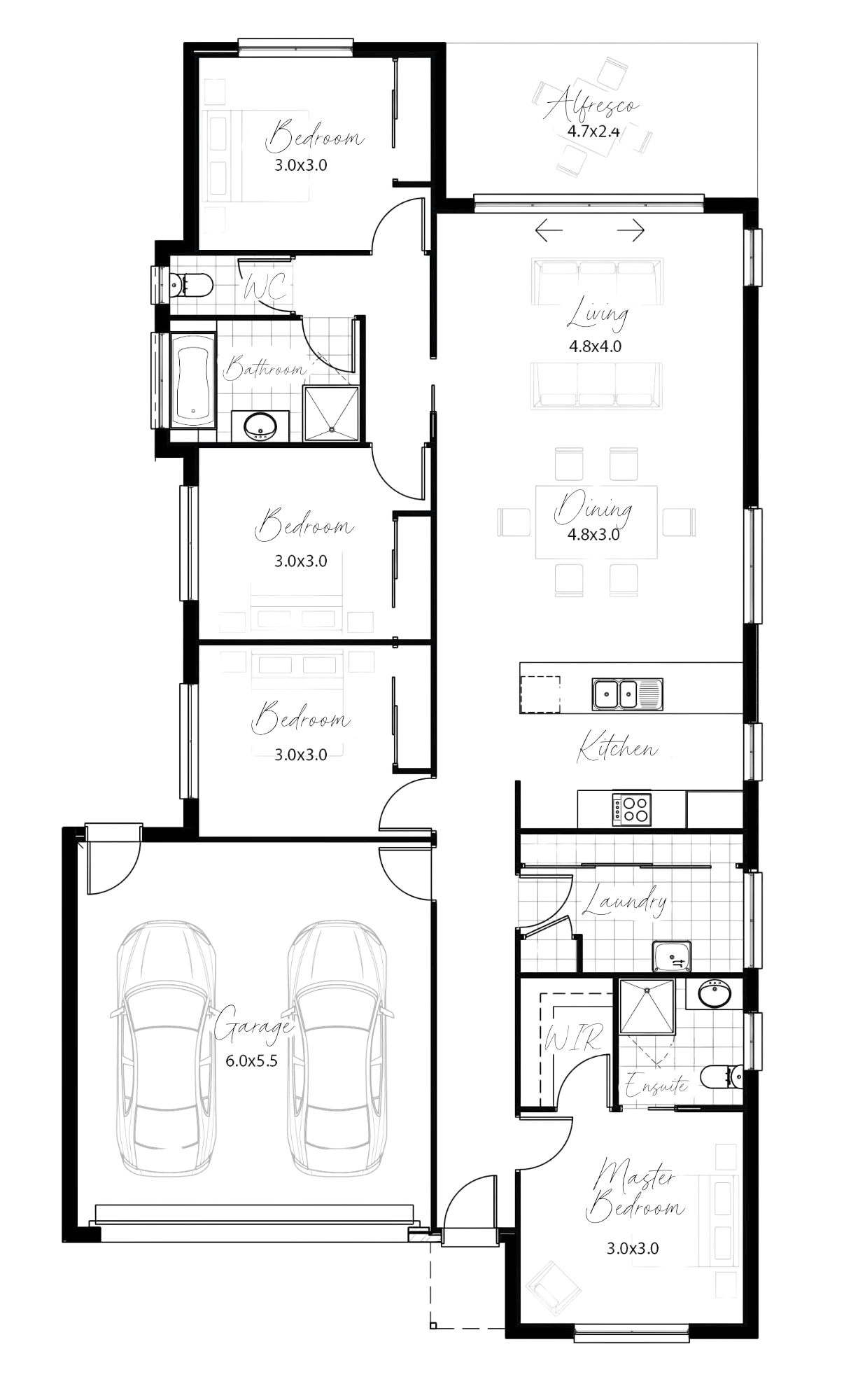 The Escape 20 residence features a thoughtfully designed single-story layout that maximizes both privacy and communal living. A secluded master bedroom sits comfortably with an ensuite and walk-in robe, offering a tranquil retreat from the home's shared areas. The heart of the home unfolds into an expansive open-plan area where the kitchen flows into the dining and family spaces, creating a central hub for daily activities. The dining area leads out to an inviting alfresco space, perfect for outdoor dining and entertaining. The home is complete with three additional bedrooms, strategically placed near the well-appointed main bathroom, ensuring accessibility and ease for all residents. This plan smartly balances the social and private spheres of home life.